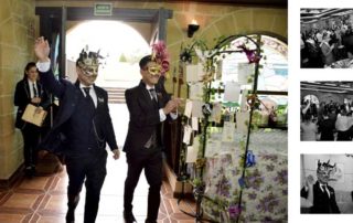 Incluso se repartieron preciosas máscaras venecianas personalizadas a cada uno de los invitados. Como así también lo eran las de los novios: diseñadas y a juego con sus elegantes trajes (también de diseño italiano). A su vez, los camareros y durante la presentación de cada uno de los platos, también llevaban sus propias máscaras venecianas. Las máscaras sin duda, fueron unos de los detalles inolvidables y más llamativos del día. Que servirían una vez transcurrida la boda, como un original y elegante recuerdo de este día inolvidable.